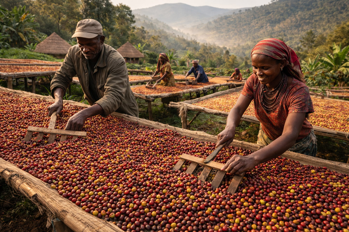 This coffee comes from the Adola area within Guji, where smallholders cultivate coffee on highland plots and deliver ripe cherry during the harvest window. The defining quality of a great natural isn’t just fruit intensity—it’s discipline. Cherry selection, drying pace, and careful protection from over-fermentation determine whether the cup becomes clean and structured or drifts into muddiness. In well-managed naturals like this one, the result is a profile that feels bright and layered, yet precise: fruit-forward and floral, with a smooth sweetness and a long, clean finish.